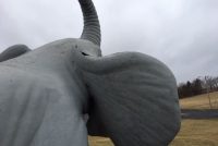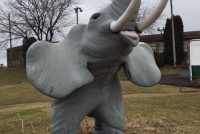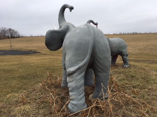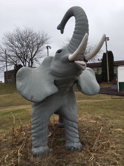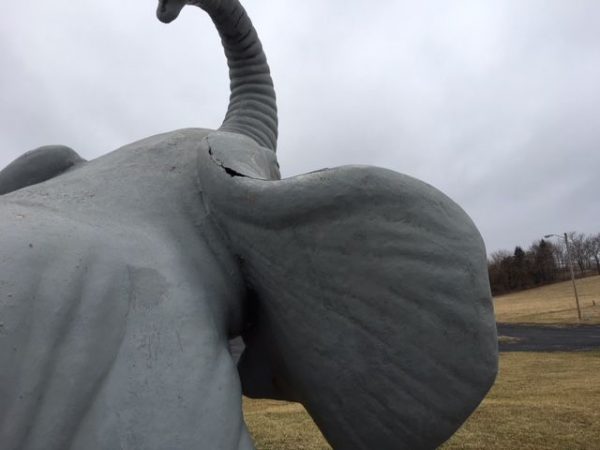 Gigantic vintage fiberglass miniature golf elephant in as found condition. Overall in very good condition for it’s age but does show signs of needing some minor fiberglass work and cleaning. This guy is almost 10′ tall and about 15′ long. Nice lawn ornament for the neighborhood……