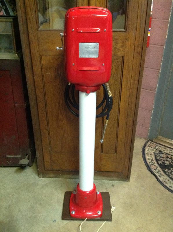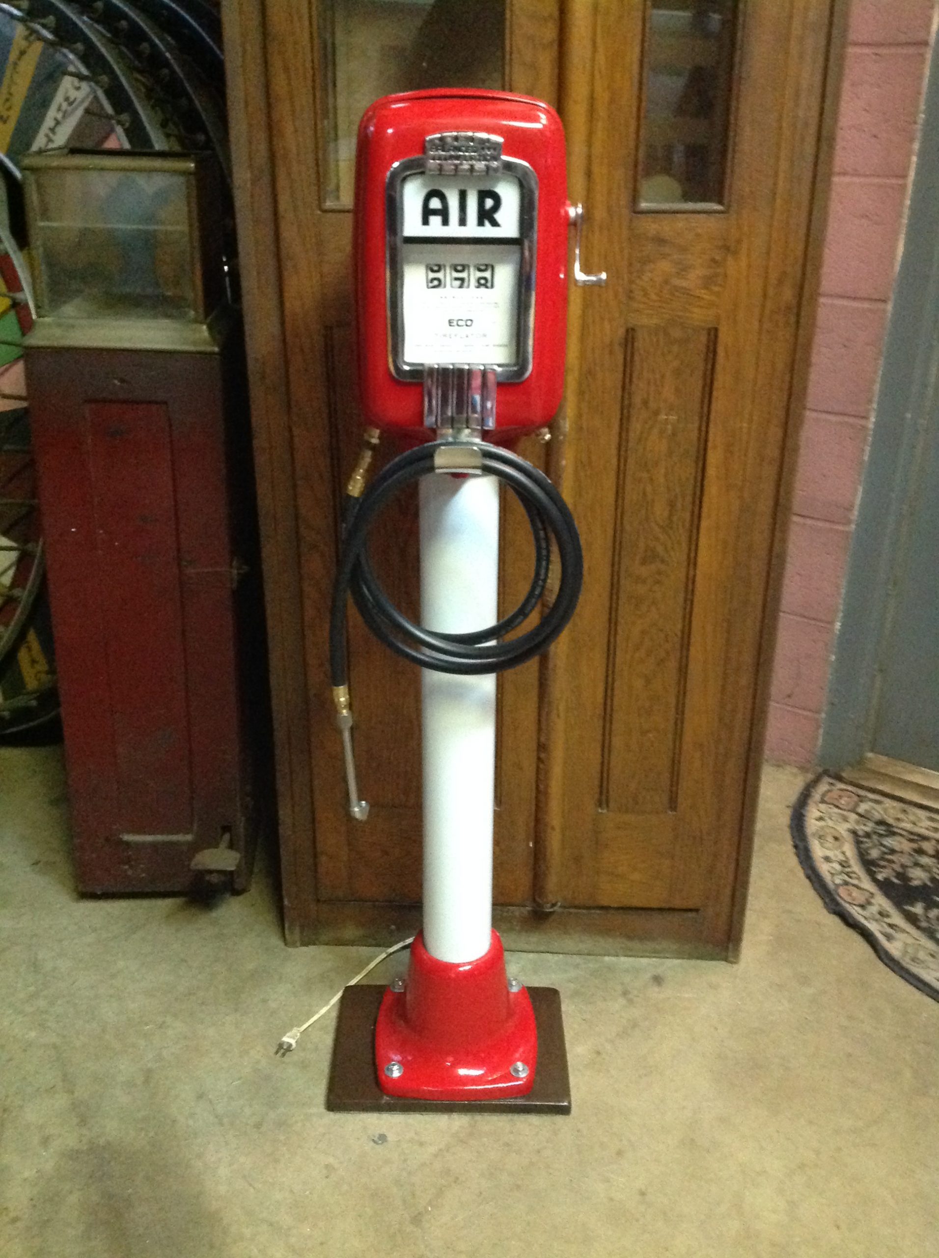 Vintage restored gas station Eco air meter in as found condition. Beautiful restoration with stainless steel replaced parts. Decorative only, will not hold air. Most parts are inside to convert it to a working meter. Priced right……….