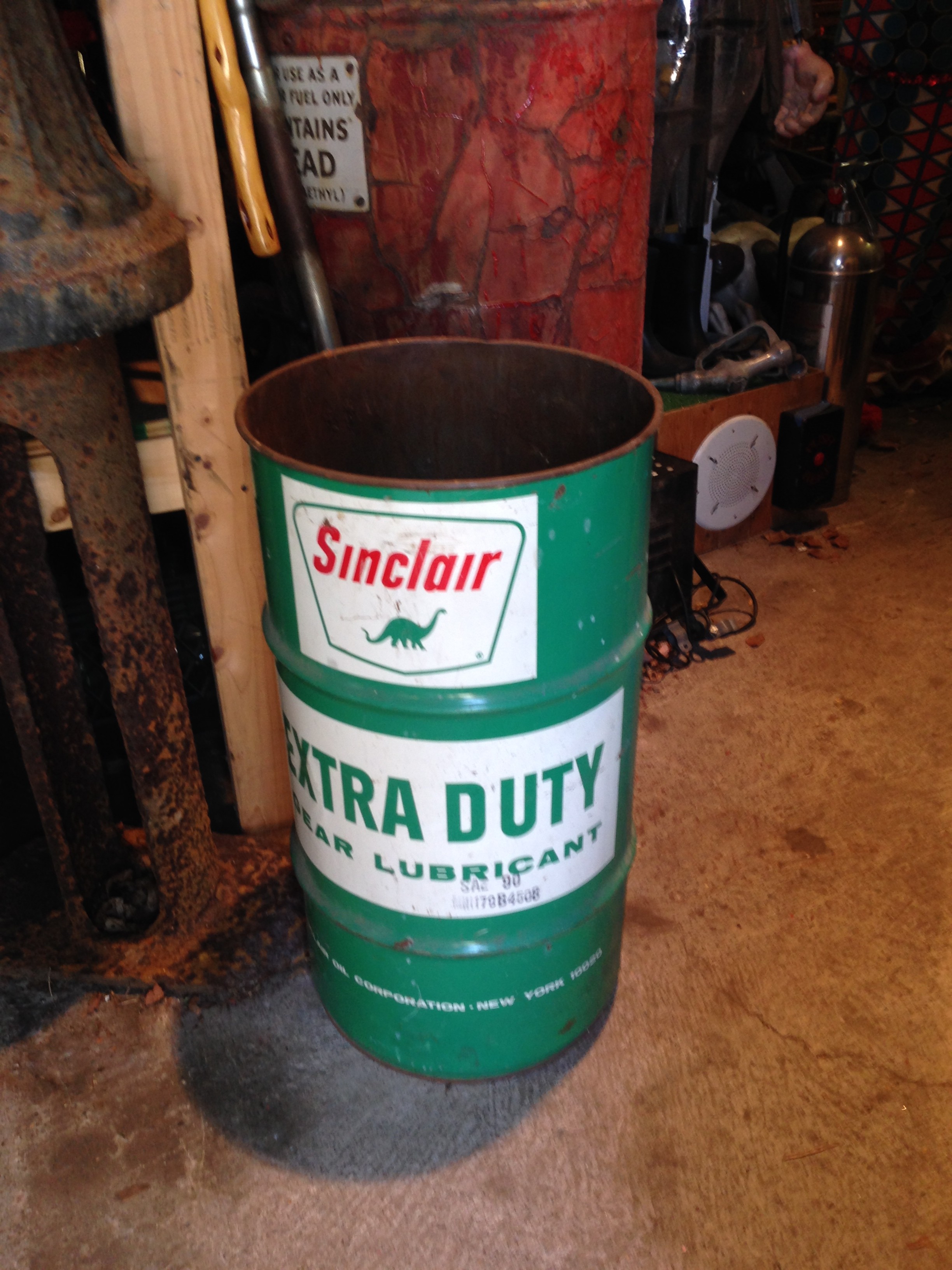 Sinclair vintage gas station grease can in as found condition. Good graphics and color. Use as a trash can………..