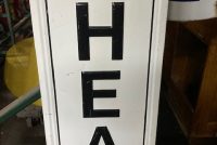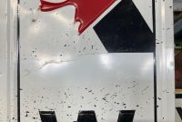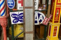 Vintaged gas station Wolf’s Head motor oil tin sign in as found condition. Some minor imperfections but does not distract from the vibrant colors of the sign, measuring in at 6 1/2′ tall x 12″ wide.
