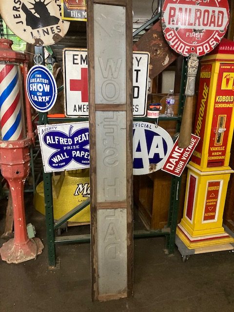 Vintaged gas station Wolf’s Head motor oil tin sign in as found condition. Some minor imperfections but does not distract from the vibrant colors of the sign, measuring in at 6 1/2′ tall x 12″ wide.
