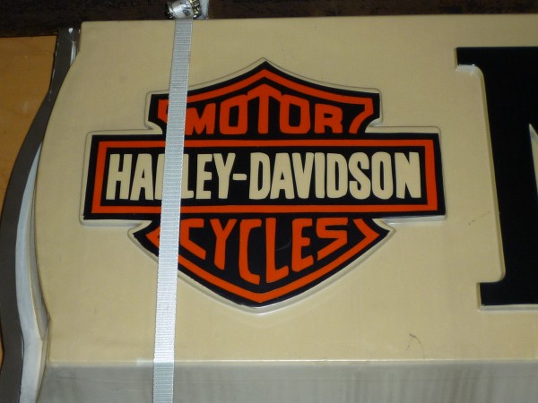 Old Harley Davidson dealership sign from a now closed Burlington, New Jersey dealer. Good graphics, double sided sign with a few stress cracks on the edges and bottom from age. Hard to find sign. Will clean up and display well. We are fortunate enough to be able to offer this sign at such an affordable price……..