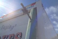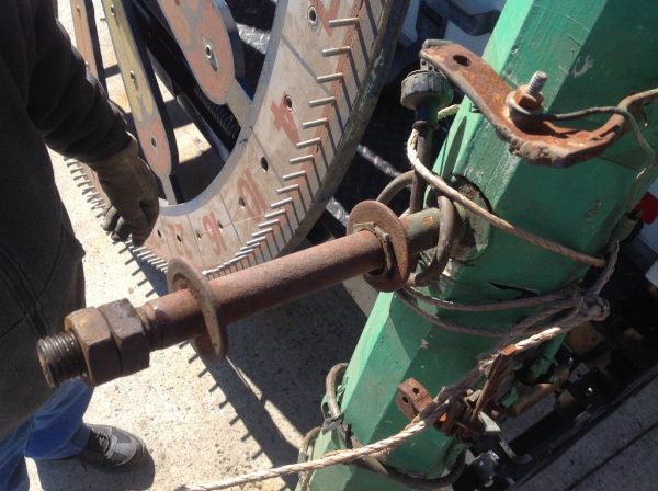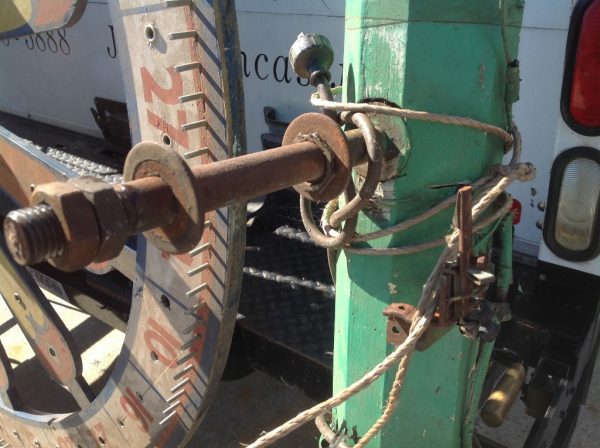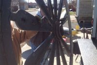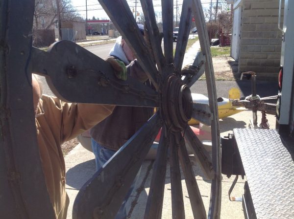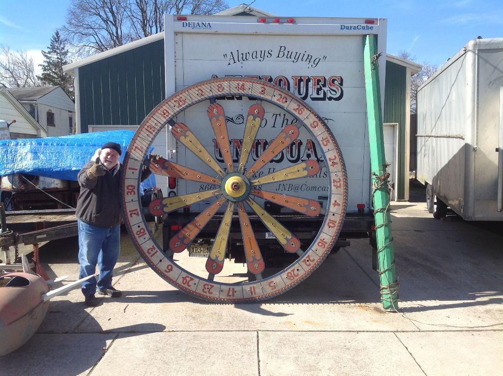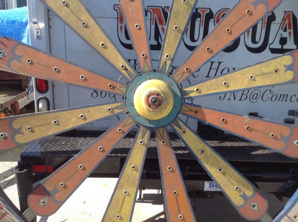 Vintage huge electrified wooden carnival gambling wheel in as found condition. Wheel measures 10′ in diameter and comes complete with the stand pole. Will need restoration and a stand pole base otherwise in good shape for it’s age. Found in a Kentucky barn from an old carnival. You won’t find another…………