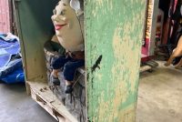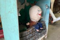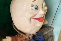 Vintage antique paper mache Humpty Dumpty amusement park animated display in as found condition. As he sits, the eyes move and egg rocks back and forth. Display will need restoration to bring him back to his glory days but everything looks original along with the scalloped wood boarder (not pictured). Quality items like this are getting harder to find in any condition. Think hard about this one………..