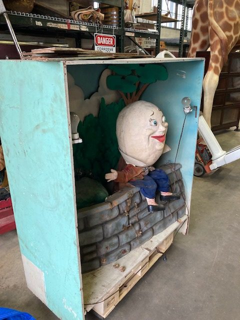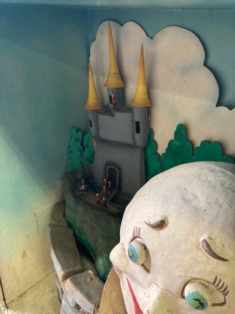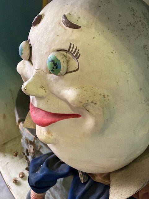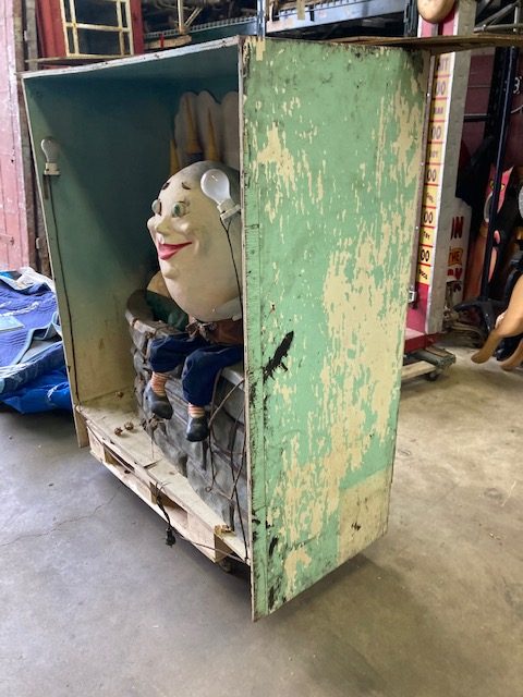 Vintage antique paper mache Humpty Dumpty amusement park animated display in as found condition. As he sits, the eyes move and egg rocks back and forth. Display will need restoration to bring him back to his glory days but everything looks original along with the scalloped wood boarder (not pictured). Quality items like this are getting harder to find in any condition. Think hard about this one………..
