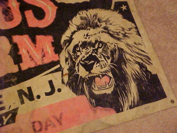 Nice old advertising circus banner from Hunt Brother’s circus. Circus was housed in Florence New Jersey and closed down in the 1970’s. Painted on canvas with a few minor tears but otherwise in good condition just showing its age. Measures 30″ tall x 5 1/2′ long……….