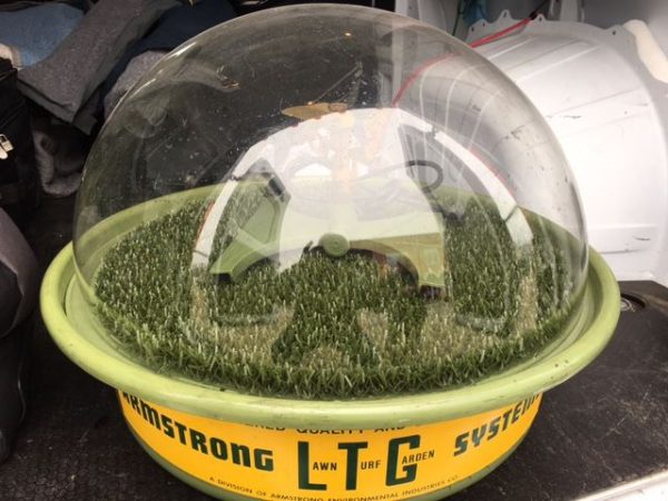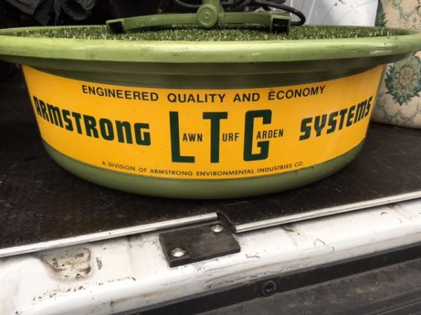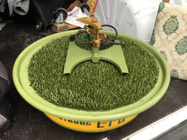 Most unusual vintage lawn, grass trade stimulator in as found working condition. Fill the greentub with water and watch as the lawn sprayer sprays the turf within the plastic dome. Real neat advertising piece…………..