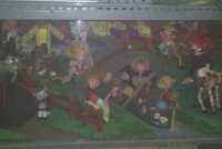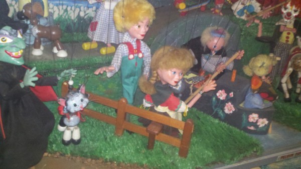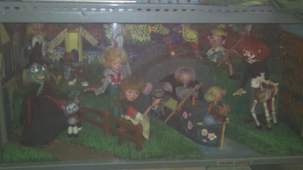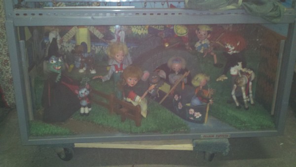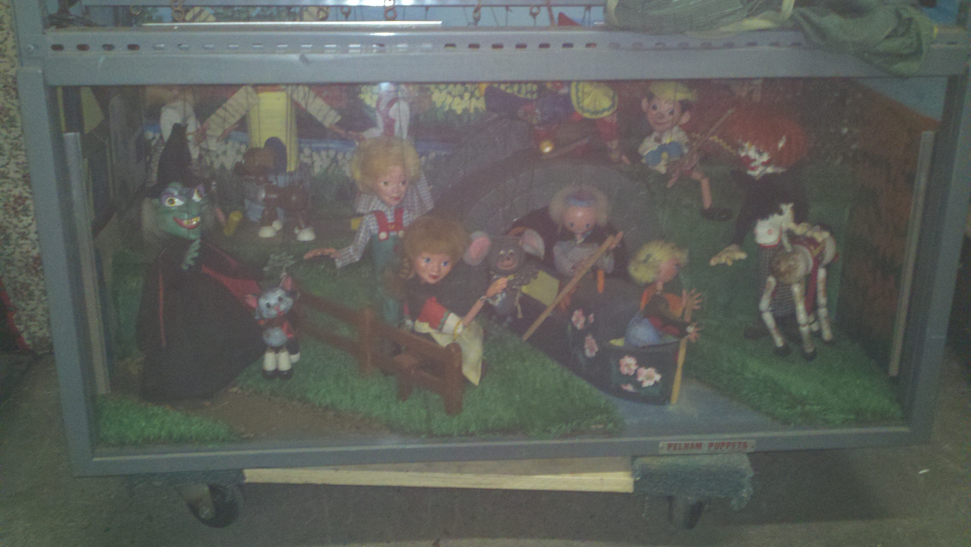 Vintage animated mechanical Pelham Puppet toy display in working condition. Will need some cleaning but otherwise looks complete with the exception of one missing light bulb. Recently found along with hundreds of vintage puppets that were stored away for the last 30 years. Pictures will be posted as we find time to open and inspect each box. If interested, please email and ask questions…..