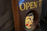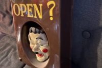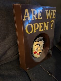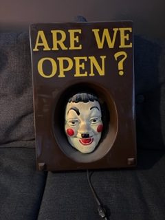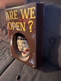 Vintage mechanical animated store display in as found condition. Neat old automaton nodder asking “ARE WE OPEN”. Face moves front to back with smooth movement. Check the face, what do you think???????????????