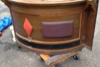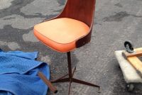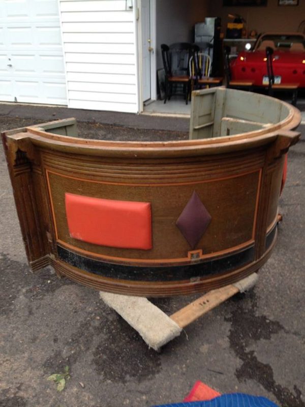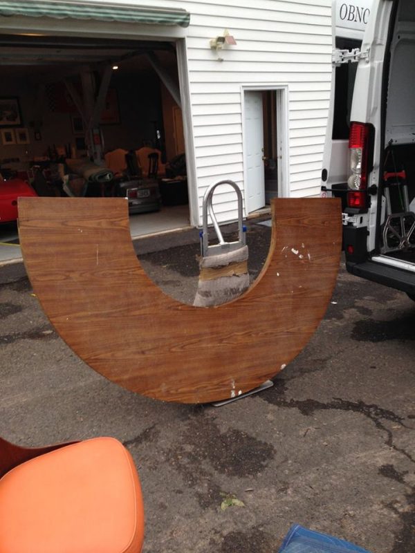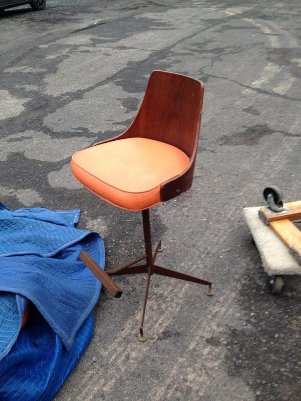 Wonderful mid-century Horn & Hardart automat bar from the now closed Horn & Hardart cafeteria in Philadelphia. Bar shows sign of wear and will need to be refinished and a new counter top installed. Comes complete with 3 matching mid-century stools. Stools will need some attention, also. You may never see another, so buy now………..