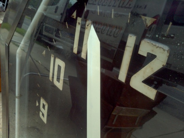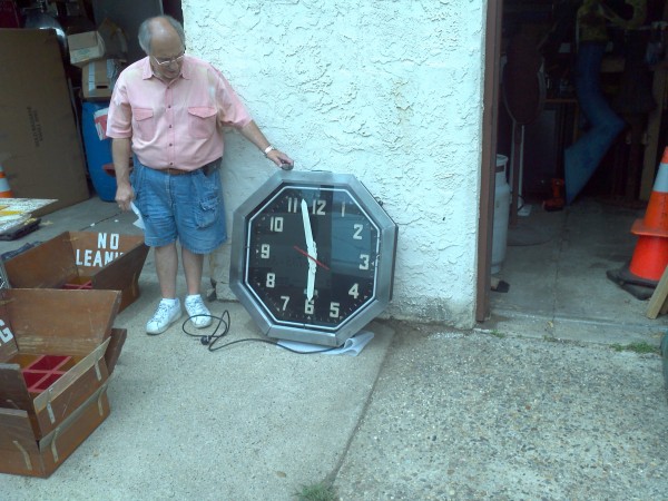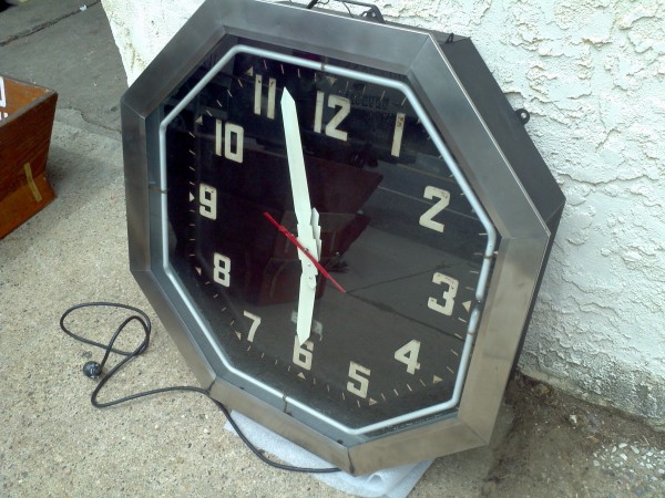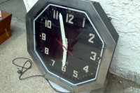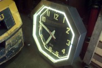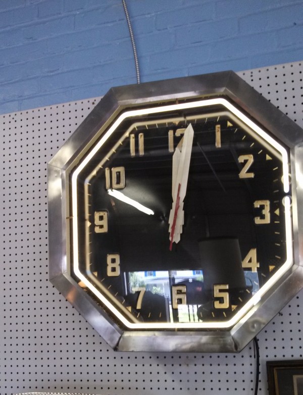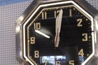 Vintage octagon mid century neon clock measuring 32″ in working condition. Raised numbers on the metal back panel with white neon and a red second hand surrounded by a stainless steel frame. Rare clock to find in this condition……….