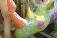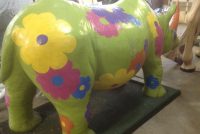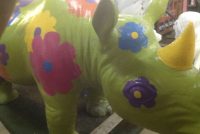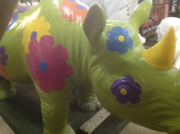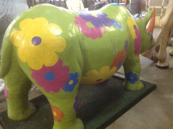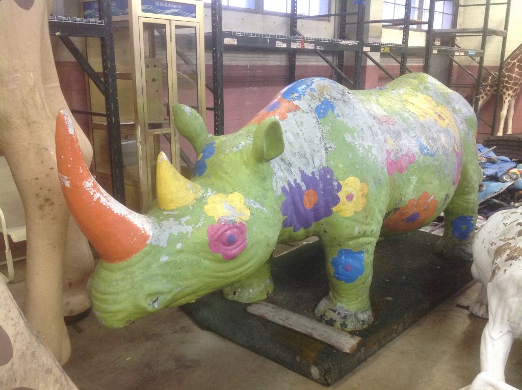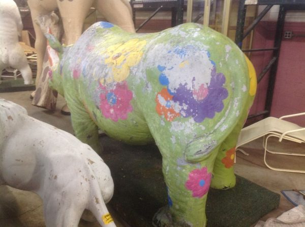 Vintage large amusement park miniature golf Rhino in as found condition. Heavy fiberglass construction with a multi colored hippie look. Overall nice shape needing minor cleanup……….