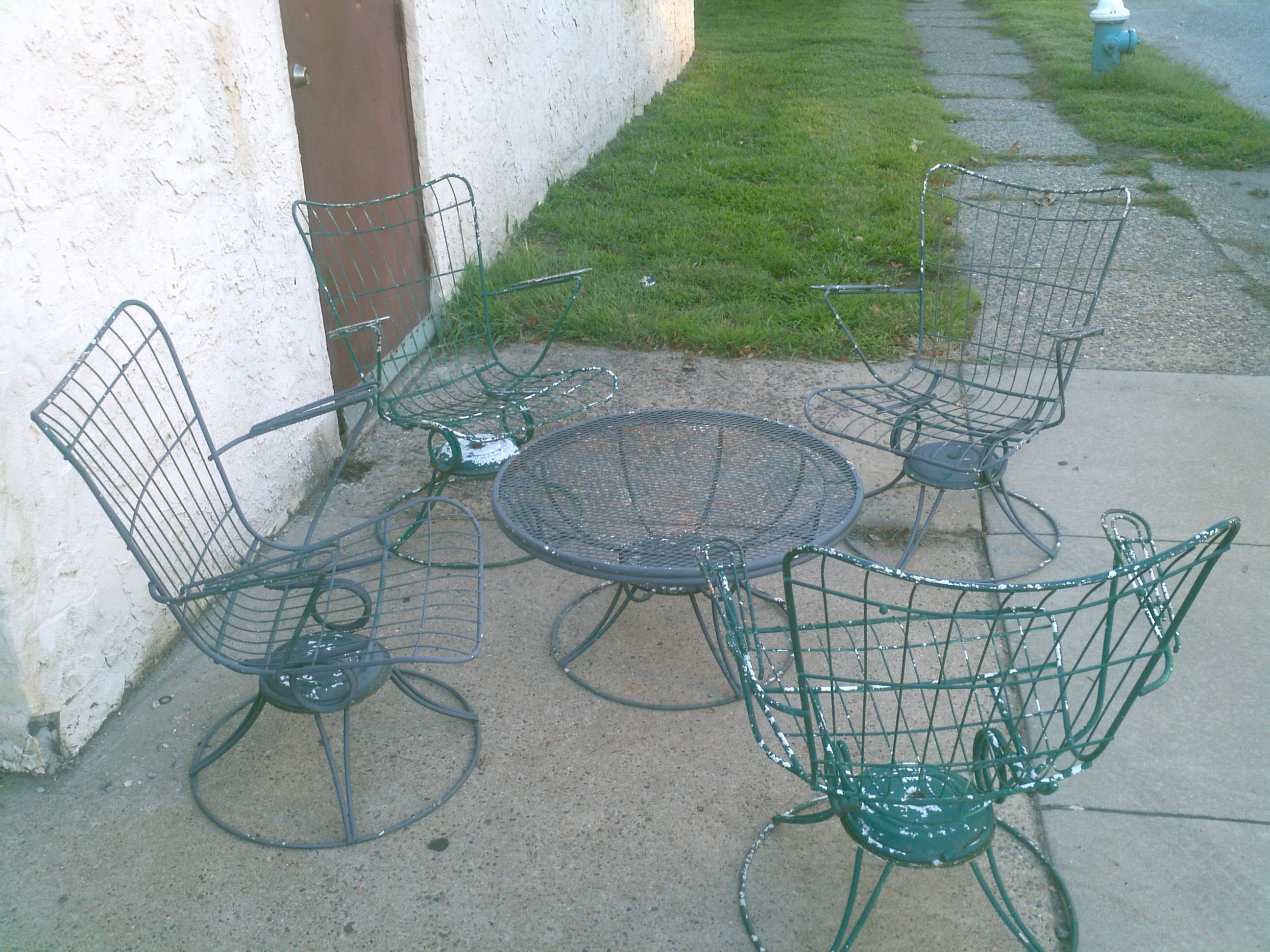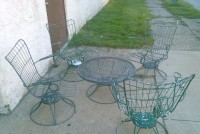 Vintage modern Homecrest wire patio set in as found condition. Taken from the back yard of an elderly couple who enjoyed this set for the past 40 years but now decided to retire to Florida. Each chair turns and rocks but may need oiling and some cosmetic work. No cushions but otherwise complete. This is a find……