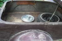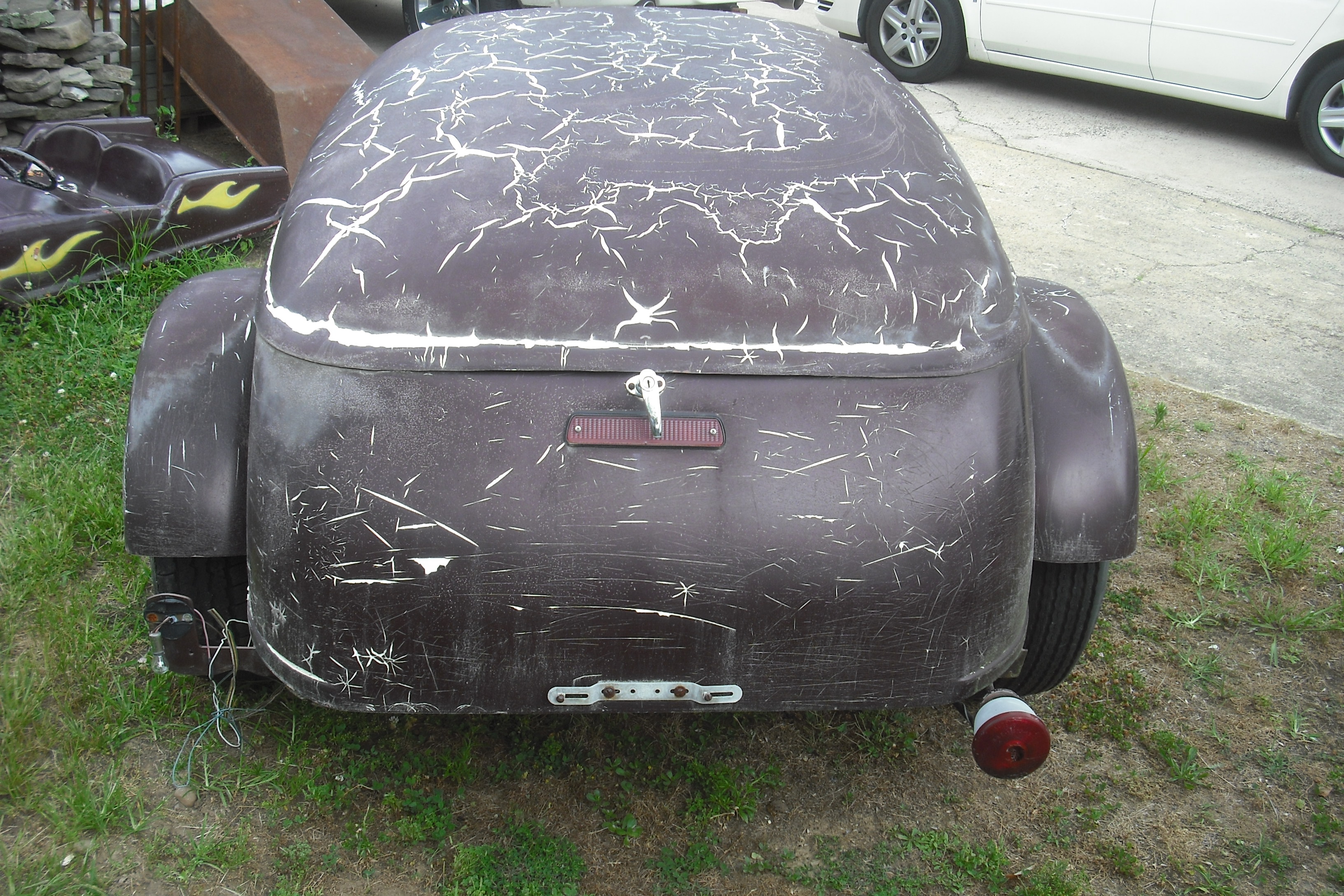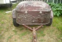 Vintage Mullins humpback motorcycle trailer form the 1960’s measuring 6′ x 4′, fiberglass with good frame. Hook up and get ready to go. Will need some cosmetic work and a good coat of paint and she will be ready for the road………..