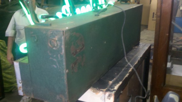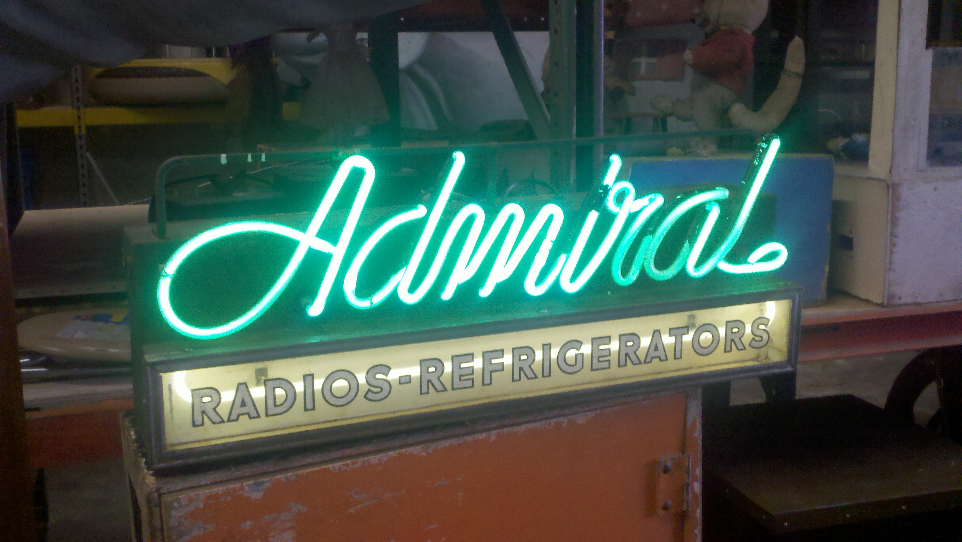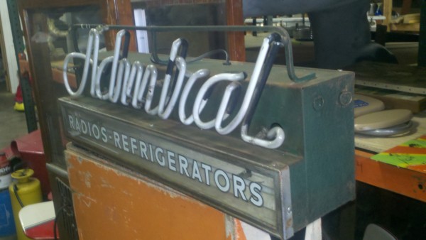 Vintage, 1950’s Admiral advertising neon in working condition. Illuminates with green neon. Will display very well. Unusual radio and refrigerator advertising………….