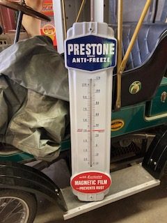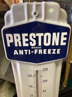 Vintage new old stock porcelain Prestone Antifreeze advertising thermometer in as found condition. Purchased from a friend who’s uncle owned a filling station back in the 1950’s. Found along with other NOS items that have been sold long ago.