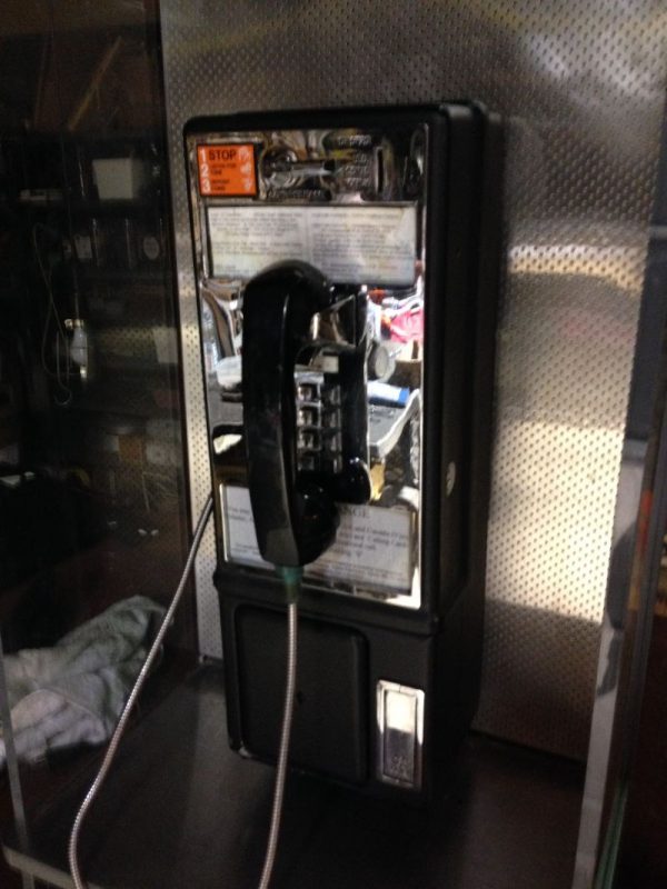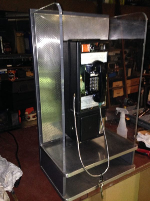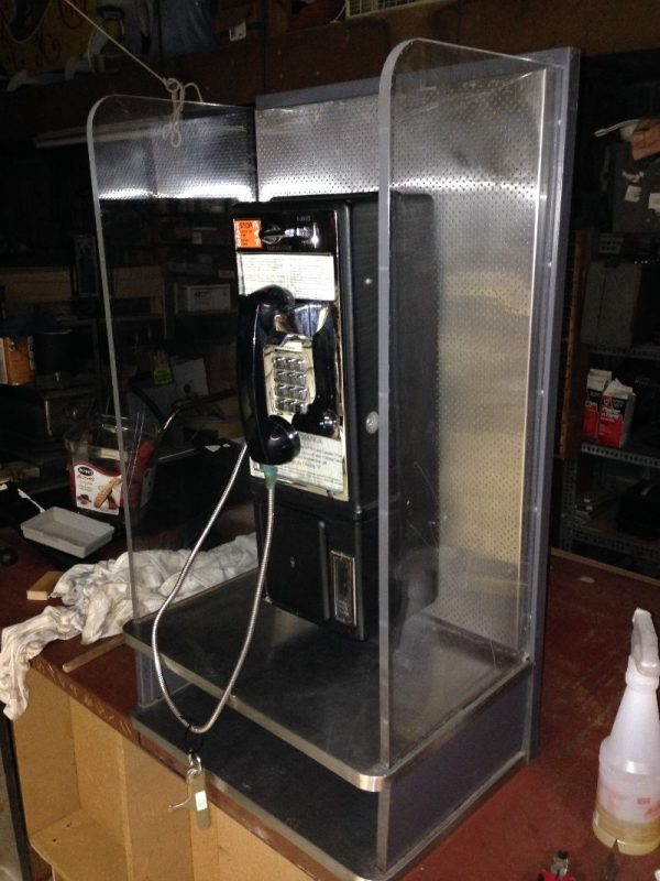 VintageĀ coin operated pay phone with Lucite enclosure in as found condition. Comes complete with both keys and T wrench. Lucite has some minor scratches that may be polished out. Phone looks complete but will need servicing. What you see is what you get. Neat gameroom item…………..
