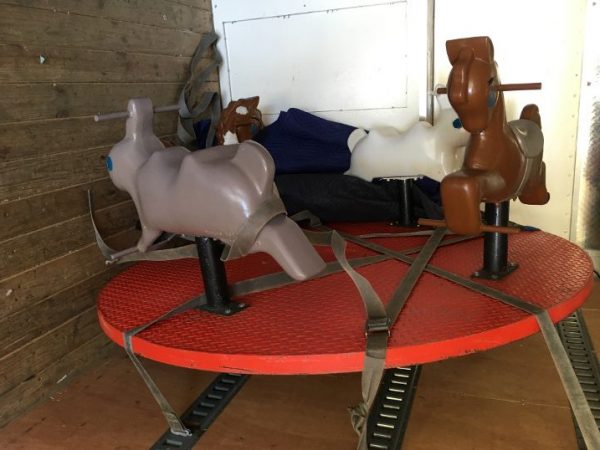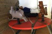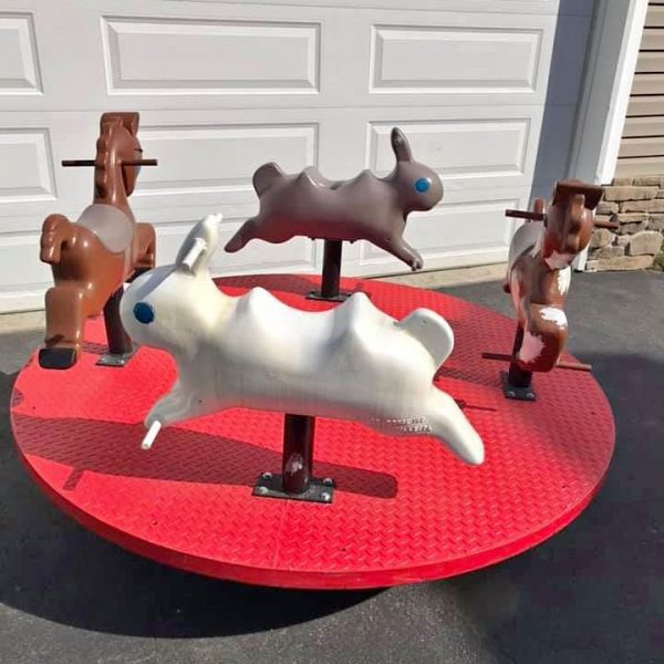 Vintage 4 figure playground child’s merry go round in as found condition. Nicely painted and ready for backyard use. Heavy cast iron. Will need to be mounted to a cement pad for stability. Think of the kids……….