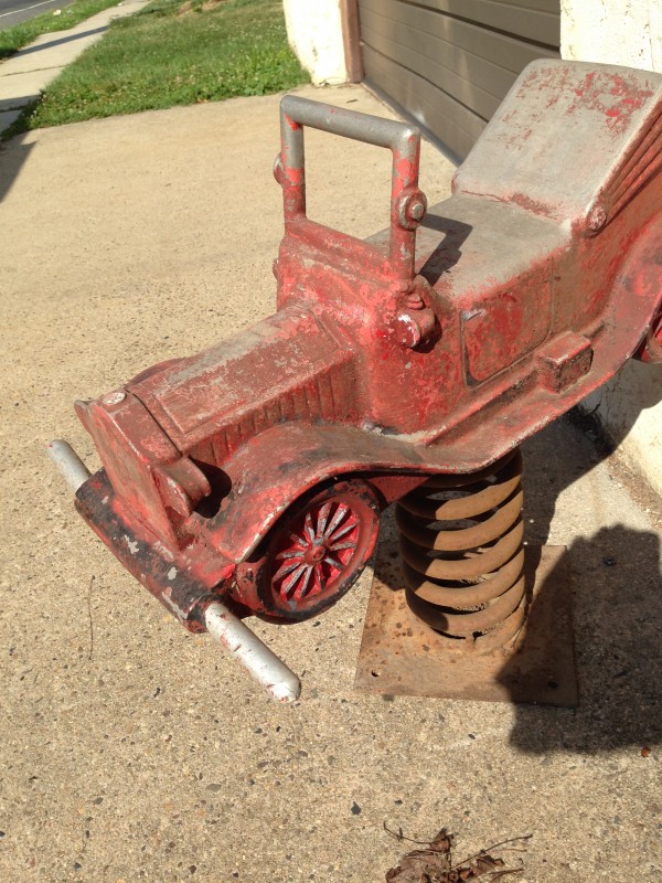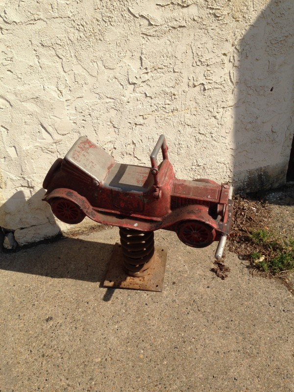 spring ride car 1 Vintage playground Model T spring ride in as found condition. Has a few defects, chip on rear bumper and stress crack on handle. Make some kid happy………..spring ride car 4 spring ride car 3 spring ride car 2