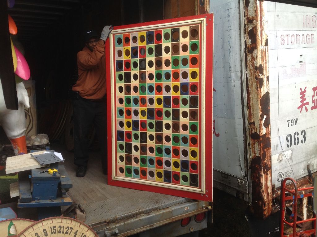 Vintage rectangular carnival ball toss game in as found condition. Nice carnival example measuring about 4′ x 5′. Great colors for displaying as wall art………..