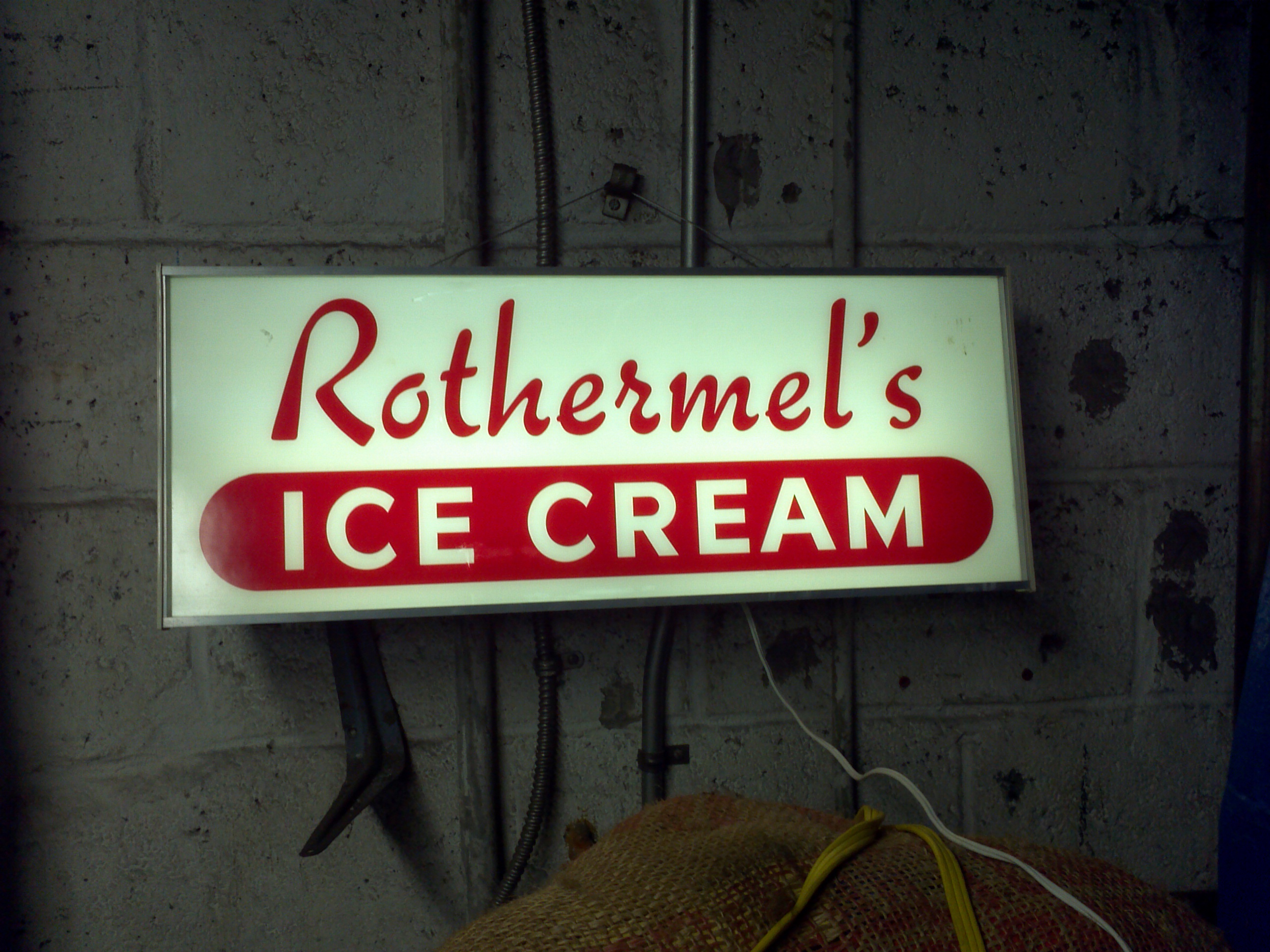 Nice old back lite Rothermals ice cream advertising sign measuring 25 1/2″ x 10″ x 4 1/2″