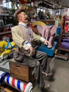 This vintage automaton came out of the famous Play Land At The Beach’s “Fun Tier Land” in San Francisco, CA. A western themed portion of the park. We believe he was built by the Philadelphia Toboggan Company based on his motors and build, likely in the 1940s. Sam rocks back and forth like he’s playing a piano and his chest moves up and down to simulate laughter. Fantastic working order. His neck and hands also have springs to create further motions. We have never seen one of these guys before in our 54 years in business. Sam is being sold needing some repair to his paper mache shoes made of paper and chicken wire. Nothing major but needed to be mentioned.