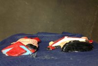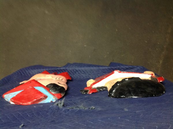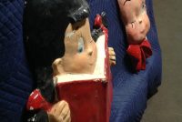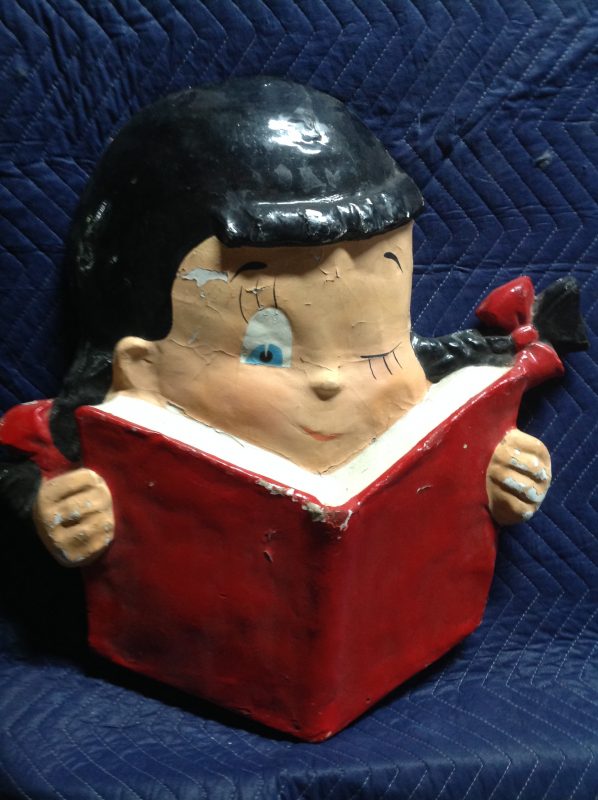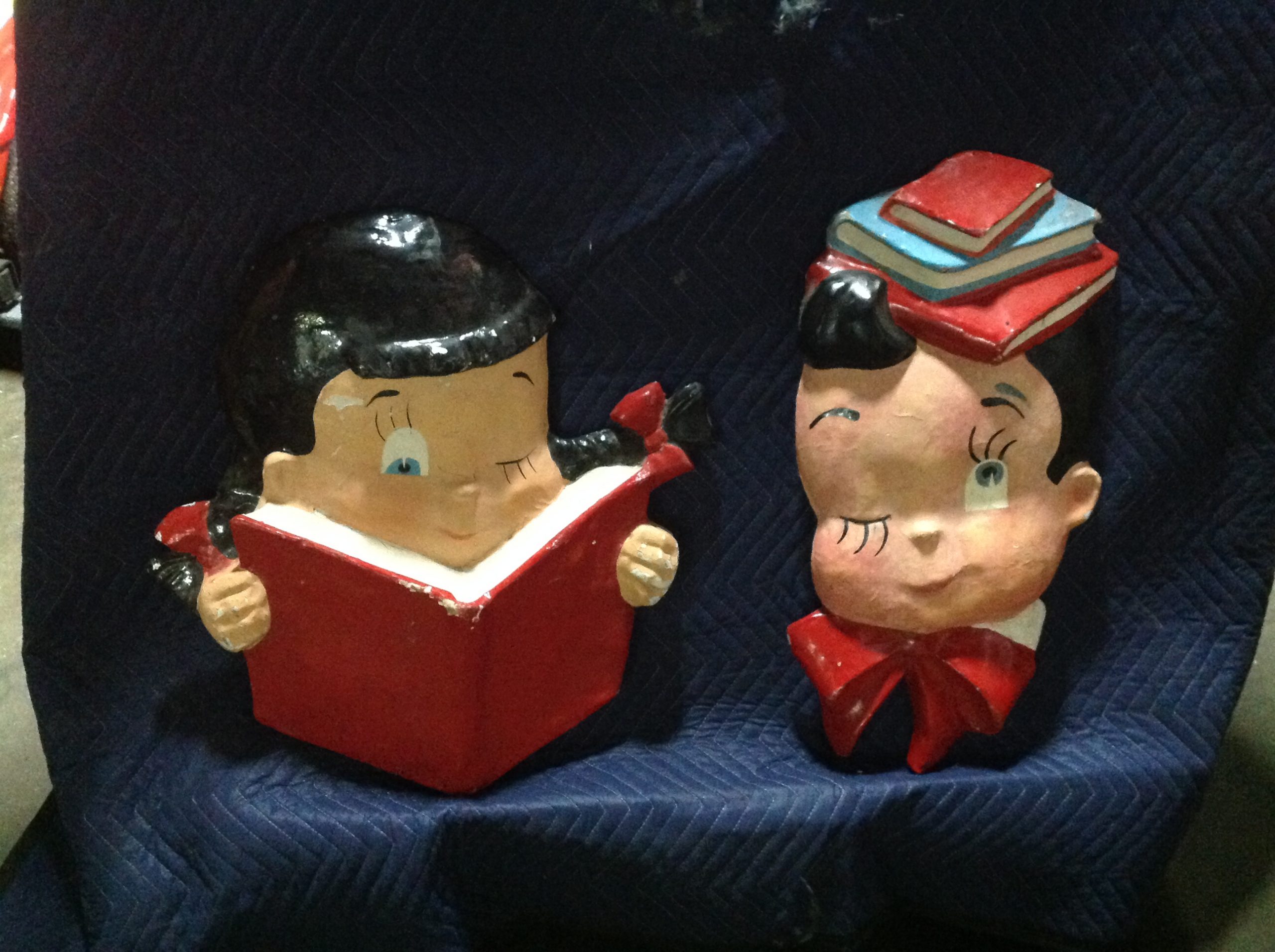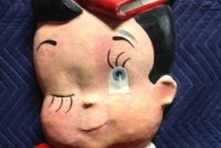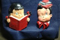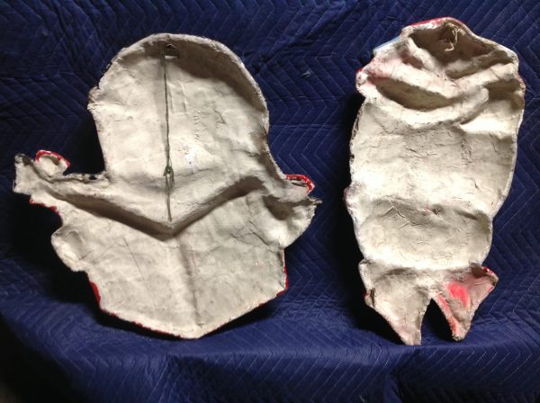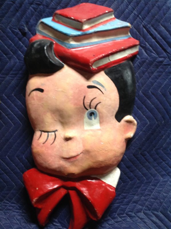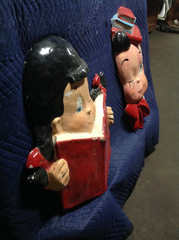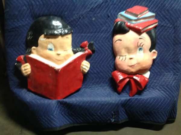 Vintage school library paper mache children faces in as found condition. Shows some minor wear but nice shape overall. Characters measure 24″ x 22″ and 24″ x 18″. Suitable for hanging…………