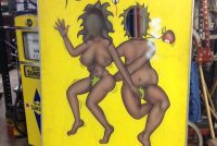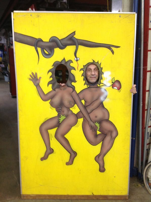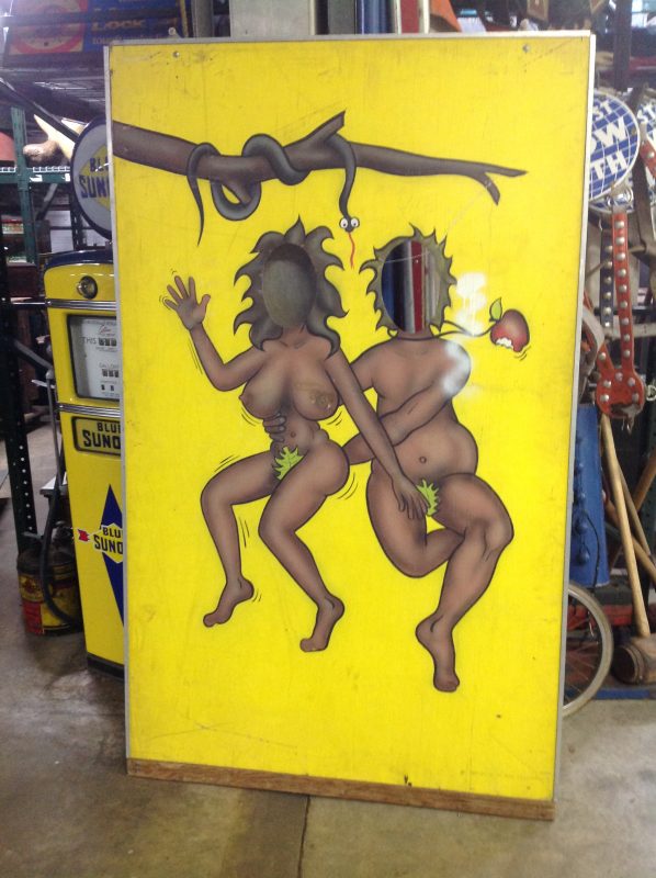 Vintage Adam & Eve Seaside Height New Jersey boardwalk cut out board in as found condition. Last used at Casino Arcade, stored away and now available for displaying. Fun old board with great graphics, measuring 4′ x 8’………….