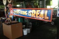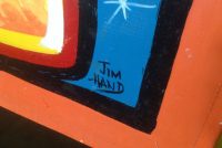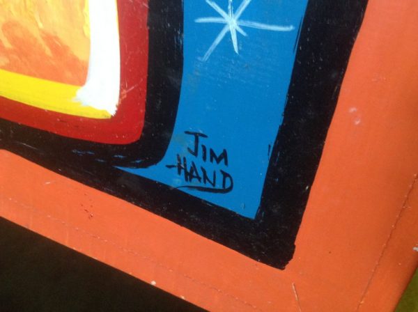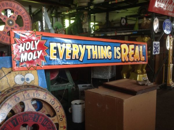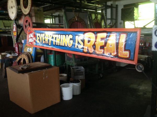 Vintage Jim Hand sideshow banner Everything Is Real in as found condition. Jim started his career under the boardwalk in Seaside Heights, NJ painting signs for the Carousel Arcade. He continued painting his way with almost all the circus and carnival companies until his passing only a few months ago. Jim’s works are sure to increase in value. Banner measures 22″ x 12″ and signed by Jim himself. Own a great piece of true Americana