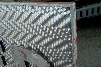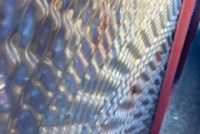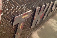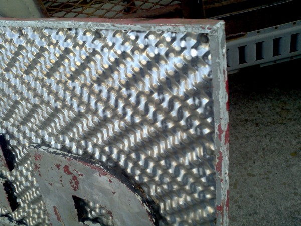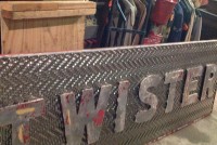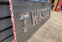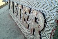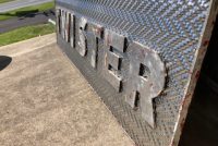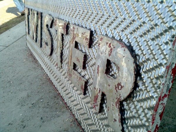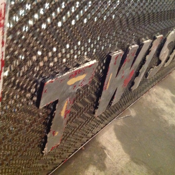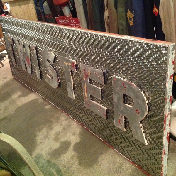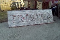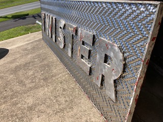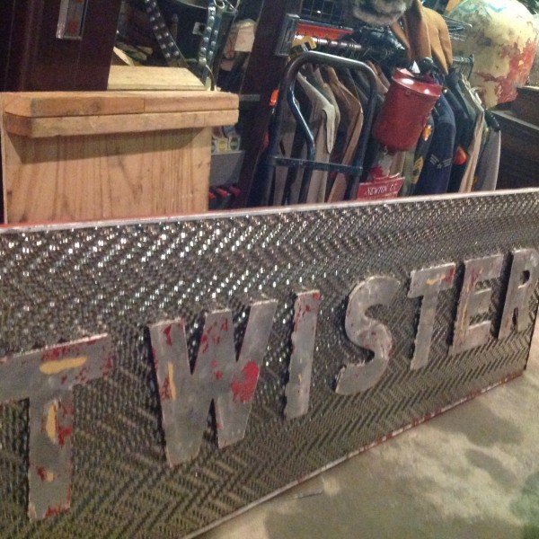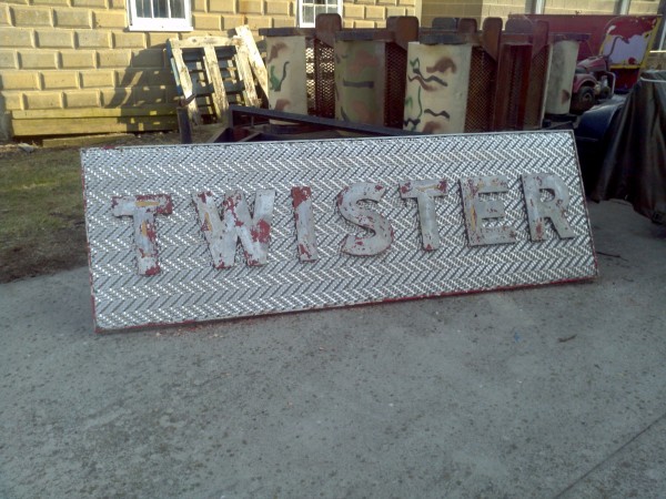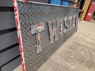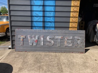 Fantastic vintage late 1950’s amusement park Twister ride sign in as found condition measuring 100″ x 36″. Embossed aluminum with heavy metal frame. Will need to be polished but otherwise in very good shape. A litle work on this sign and it will “POP”…….