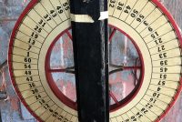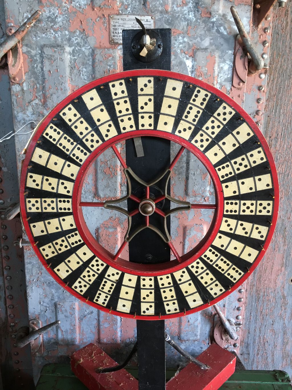 Vintage double sided carnival gambling wheel with stand in as found condition. Barn fresh needing some minor cleaning. Measures about 24″………..