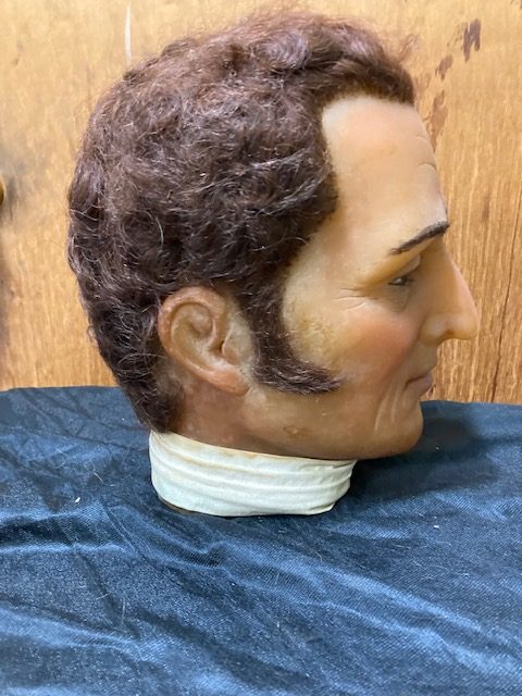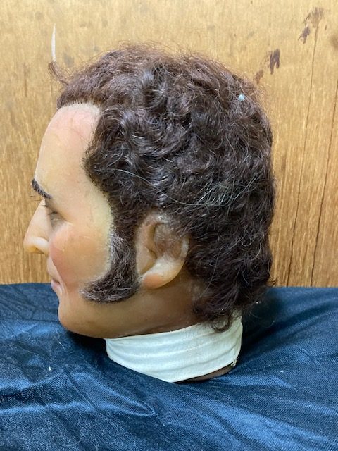 Vintage wax museum Creepy Guy With Sideburns wax head in as found condition. Maker unknown. Purchased recently from a deceased collectors estate. Real hair, nice wax detailing needing some cleaning but overall in nice shape for its age. Interested, just ask questions………..