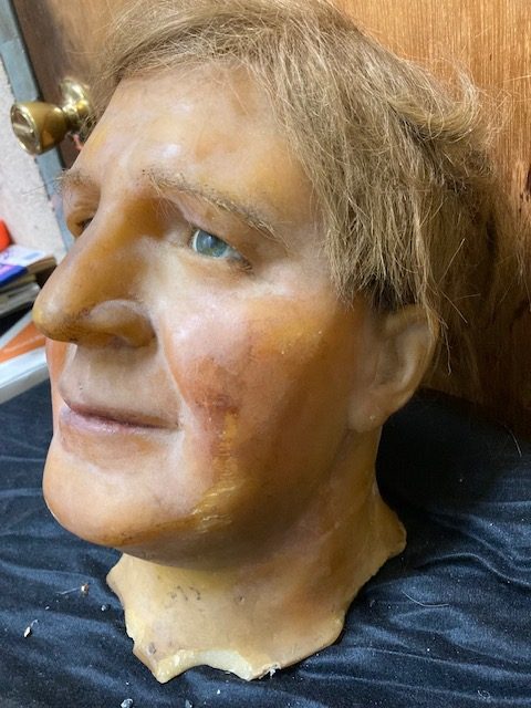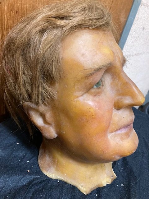 Vintage wax museum Dude With Blue Eyes wax head in as found condition. Purchased from the estate of a collector of weird and unusual items. More heads to be posted. Figure looks good needing a cleaning with real hair. Interested, ask questions about more condition details…..
