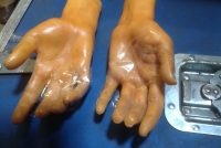 Vintage wax museum full figure Sleeping Beauty’s Maid in as found condition with hand problems. Right hand has a broken pinky finger as well as the left hand with a thumb and 2 broken fingers. Finger pieces are there to make repairs. See picutres below for details. Head signed Stubergh. Please she needs a good home………