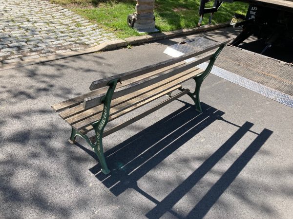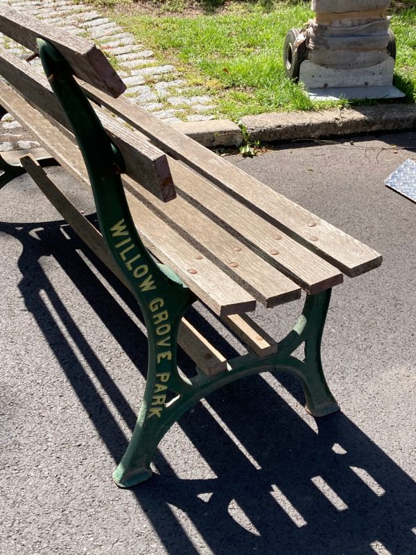 Ultra rare amusement park bench from the famous Willow Grove Park, Willow Grove, PA. Park went out of business over 45 years ago and not many items survived or have been offered for sale. Bench has cast iron supportsĀ with the name of the park molded in and wooden slats that show signs of years of use to make this a killer collectible. Don’t let this neat old piece pass you by as they are getting harder to find in any condition. Own a piece of American history. Park was demolished and replaced with a shopping mall.