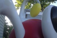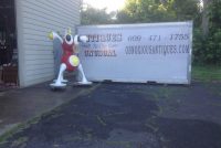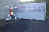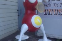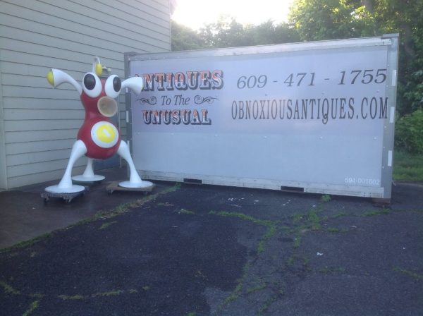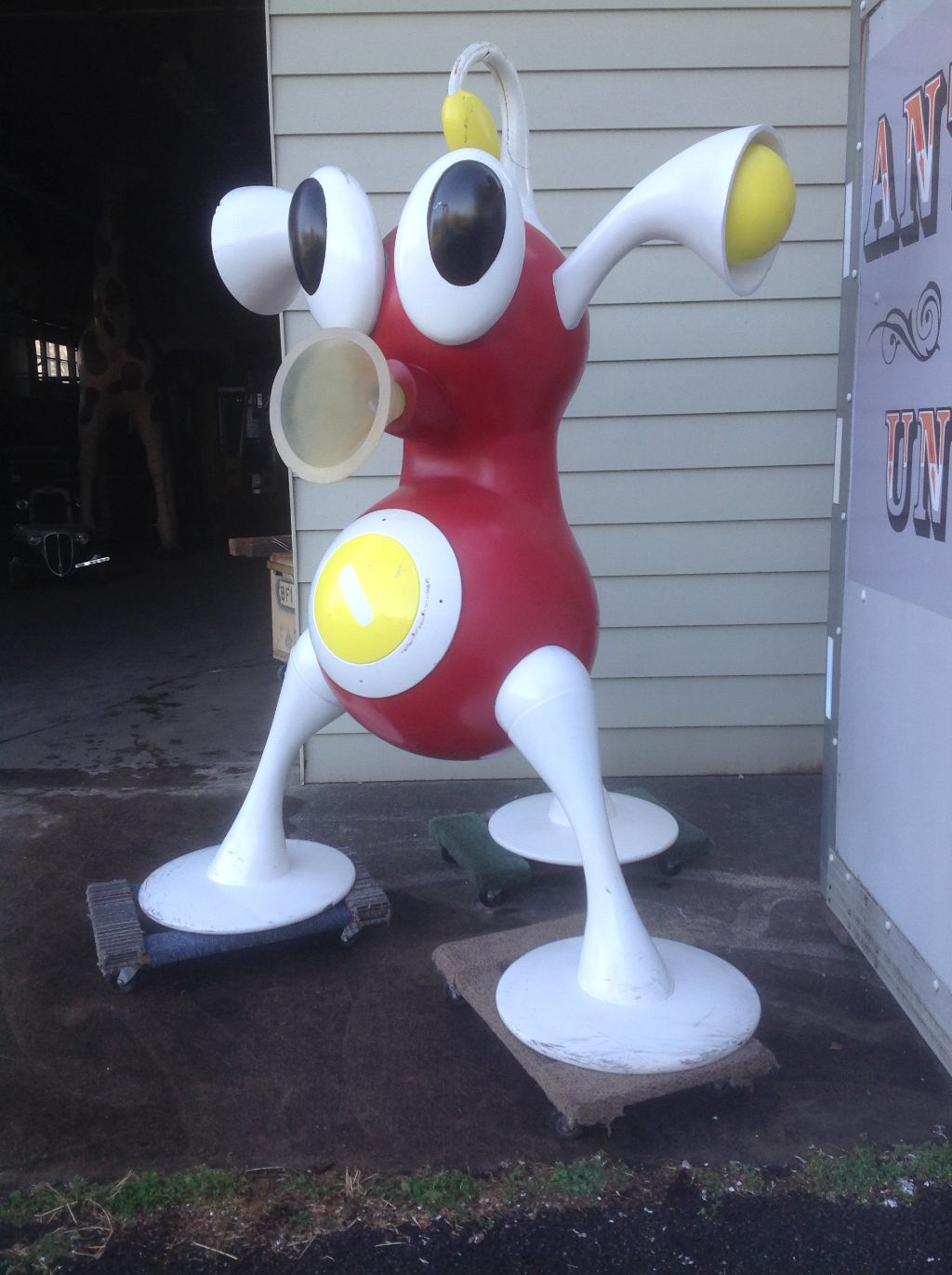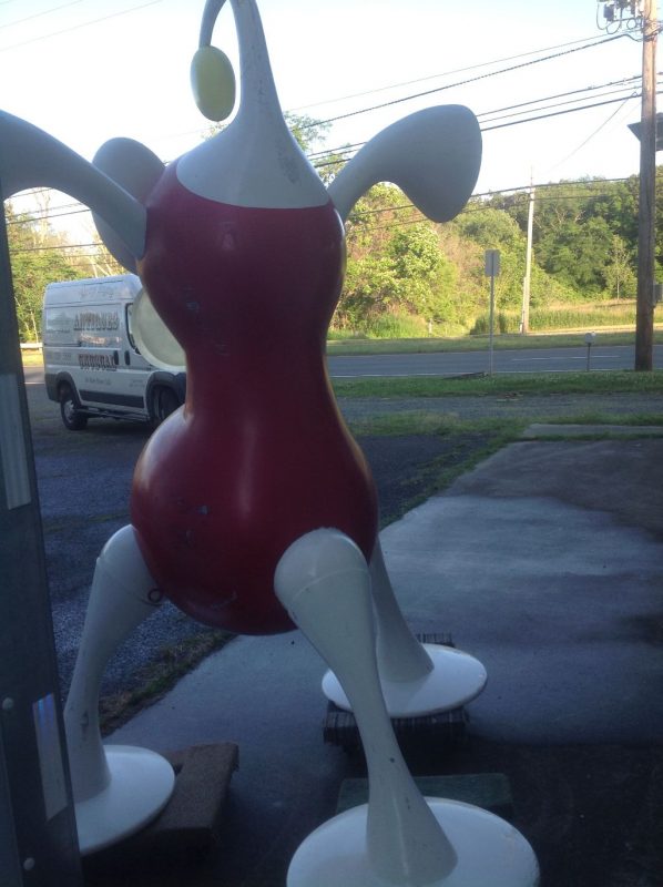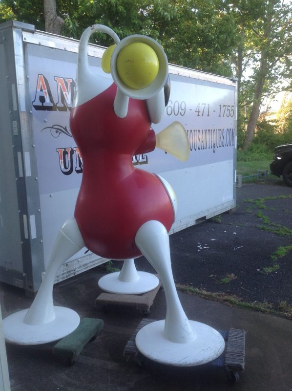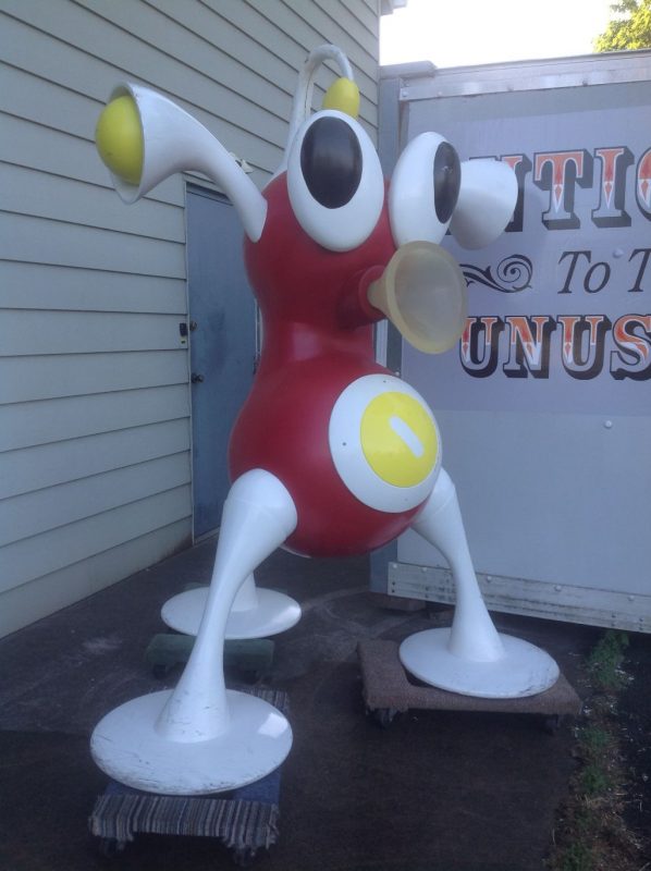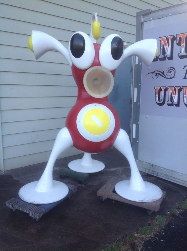 Rare vintage Zizzle iz toy store display statue in as found condition. Not many of these around. A Zizzle iz was an electronic musical toy released in September 2005 from Zizzle. Taking the shape of a abstract tripod figure the iz allowed the user to interactively manipulate music by twisting parts of the figure’s body. Statue is in very nice shape but will need some minor restoration to the curved top head section long with installation of a light package that illuminated his weird funnel like nose. Found in a abandoned warehouse in Northeast Philadelphia. Heavy fiberglass construction. A real neat conversation piece. Don’t let this one pass you by………..