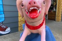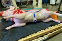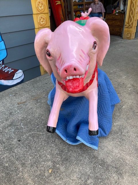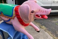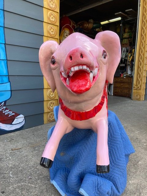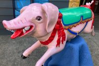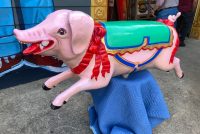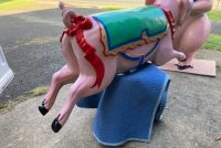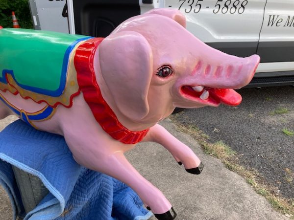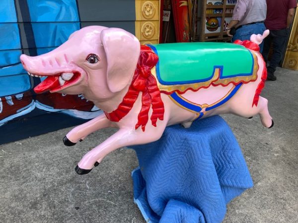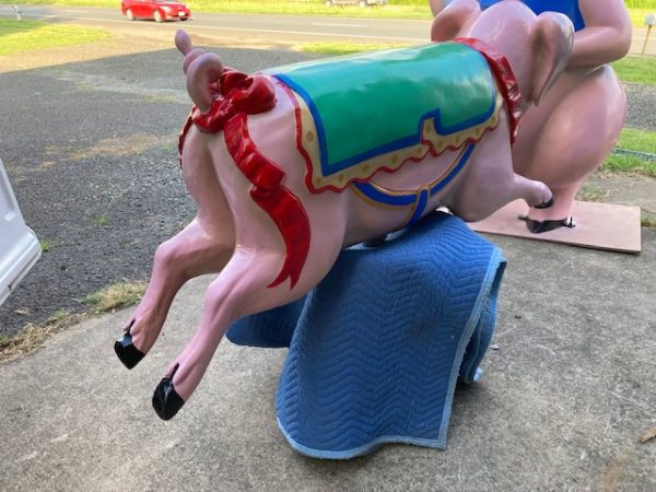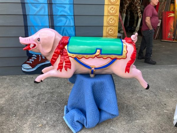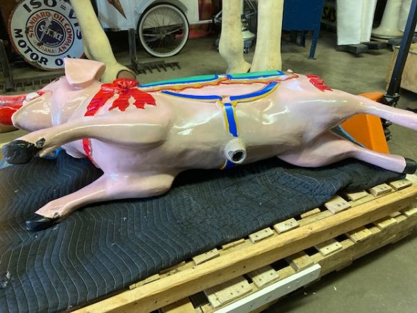 Vintage heavy construction fiberglass Merry Go Round Carousel Pig in restored condition. Porker measures 66″ long nose to hoof x 27″ high x 12″ wide.