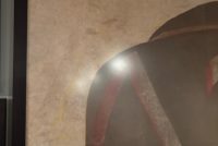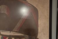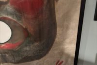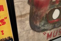 From Baraboo Wisconsin when they were cleaning out their old storage in the 90s, this hand painted canvas ball pitch game was used by Ringling Brothers during the war. Customers would throw a ball at him in hopes of getting it in his mouth to win a prize. Circuses and carnivals were allowed to operate during the war as citizens on the homefront needed some sort of amusement, and it was also a good source for war bond sales. One of a kind amazing piece of history. Measures 43×56.5” in the frame, but is a bit wider as the canvas was folded to accommodate the frame. Can be shipped out of the frame if needed. Several grommets along all sides. You will never see another….