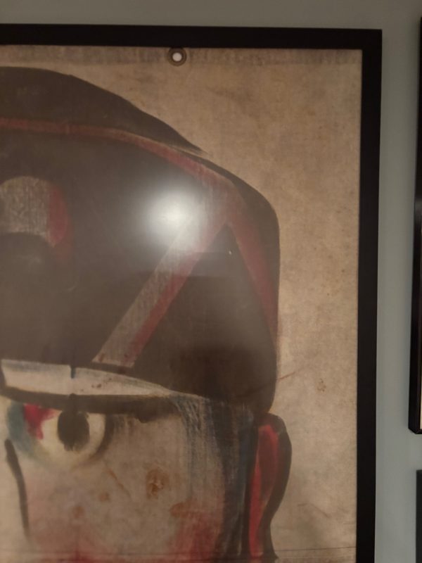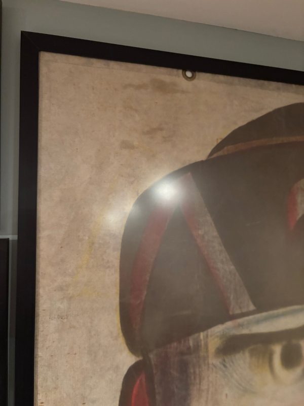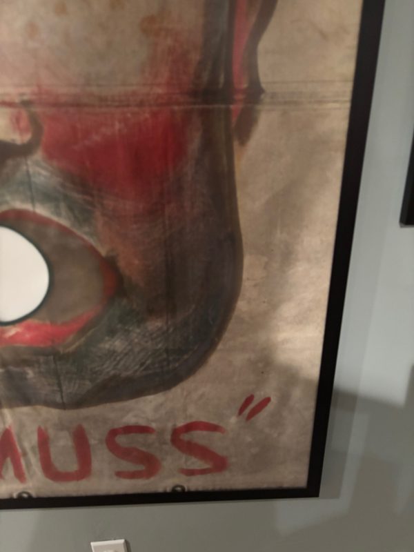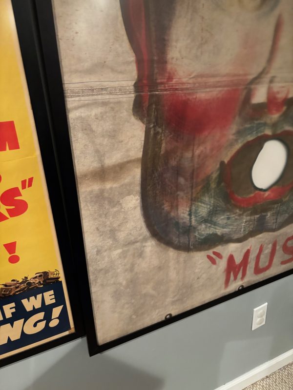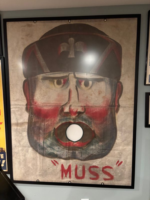 From Baraboo Wisconsin when they were cleaning out their old storage in the 90s, this hand painted canvas ball pitch game was used by Ringling Brothers during the war. Customers would throw a ball at him in hopes of getting it in his mouth to win a prize. Circuses and carnivals were allowed to operate during the war as citizens on the homefront needed some sort of amusement, and it was also a good source for war bond sales. One of a kind amazing piece of history. Measures 43×56.5” in the frame, but is a bit wider as the canvas was folded to accommodate the frame. Can be shipped out of the frame if needed. Several grommets along all sides. You will never see another….