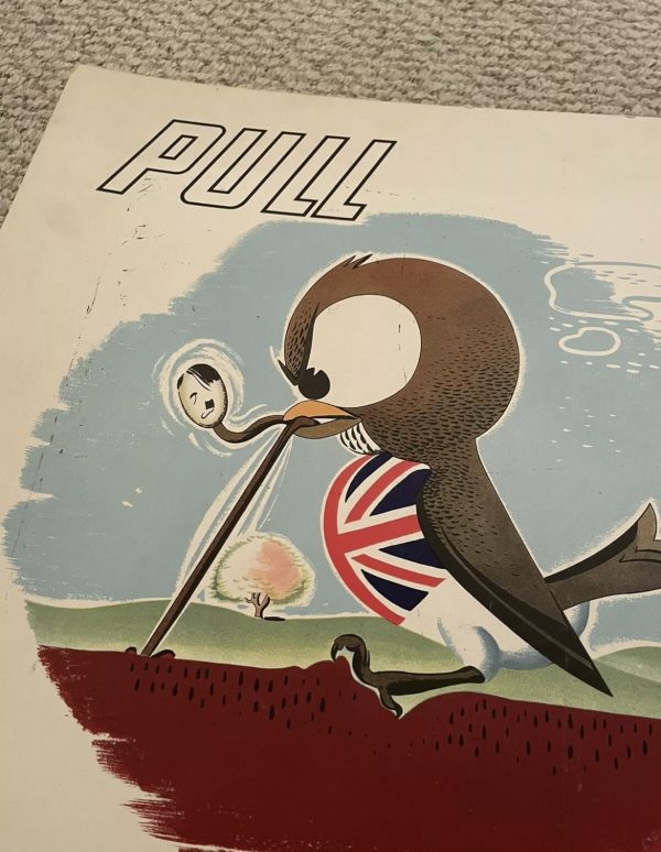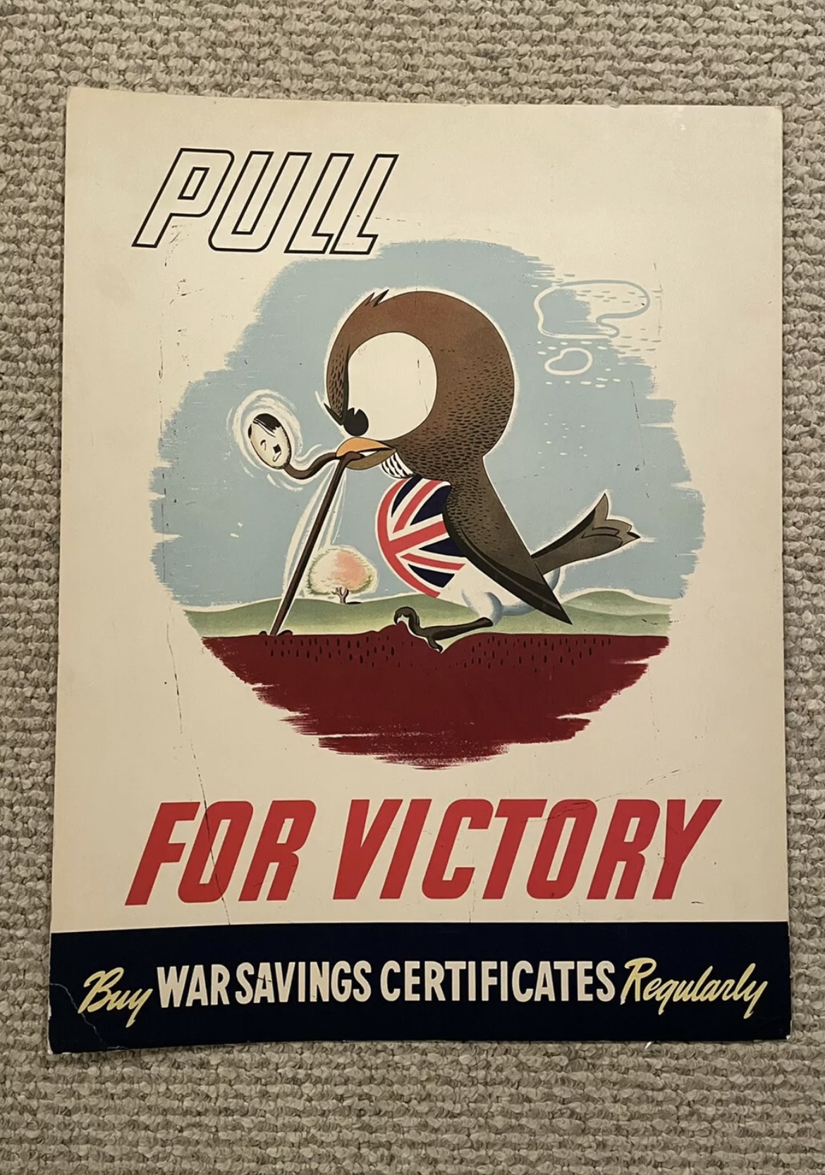 Anti axis British savings certificate poster with a bird pulling a worm resembling Hitler.