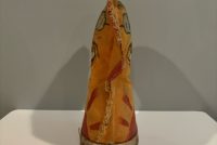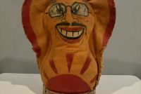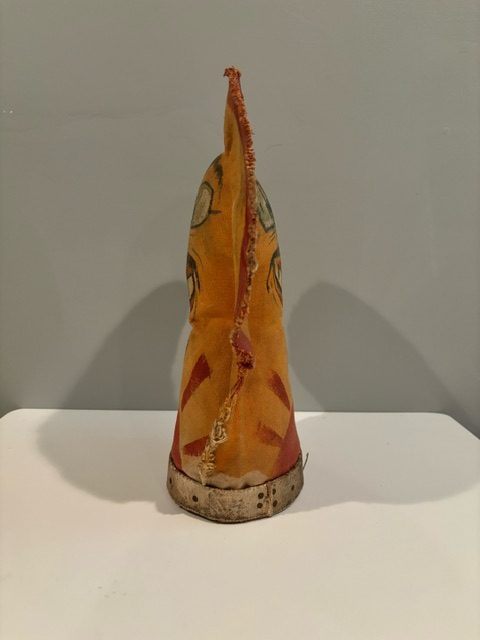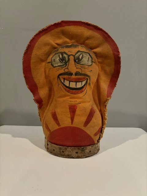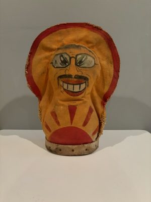 Who wouldn’t want to toss a ball right at Tojo’s face?! Many carnivals during WWII created targets of the three Axis leaders- Hitler, Tojo and Mussolini. These popular pieces were mostly painted over after the war and made into different figures, or were so beat up they were discarded. This rare, hand painted piece survived and is still in excellent condition for its age. Hand painted and double sided. Measures 14” tall and 10” at the widest part.