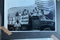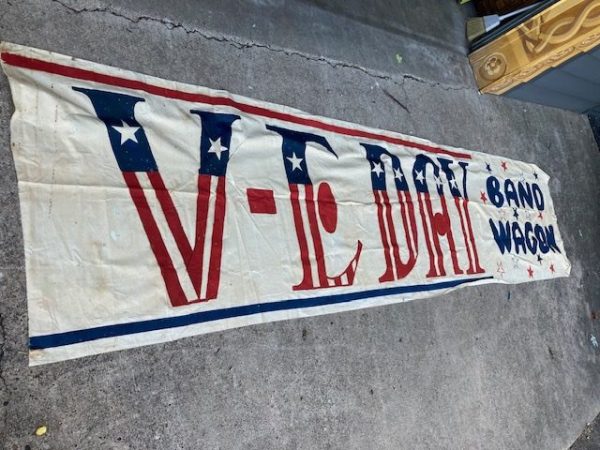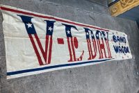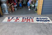 Amazingly rare VE Day Banner which was placed on a parade float to celebrate the death of Hitler and the fall of the Nazis. This banner was hand painted by and the photo album belonged to Hyman F. Kaplan who served in the